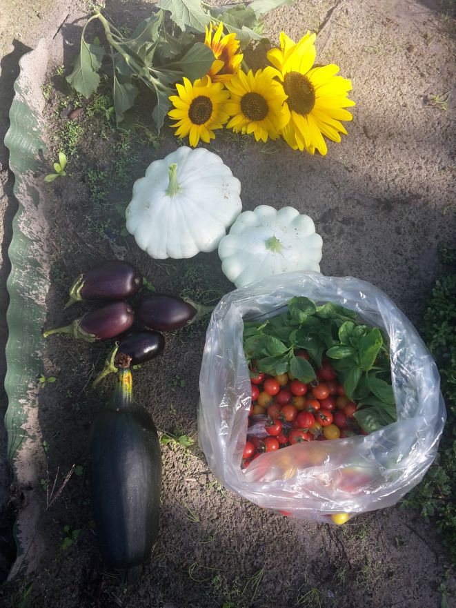 Daarnaast nog wat 'echte' oogst uit de tuin: heel veel tomaatjes, patisson, aubergine, courgette en wat kruiden. En wat geknakte zonnebloemen voor de gezelligheid! Nu tomatensaus maken! Heerlijk zo'n vrije dag......
