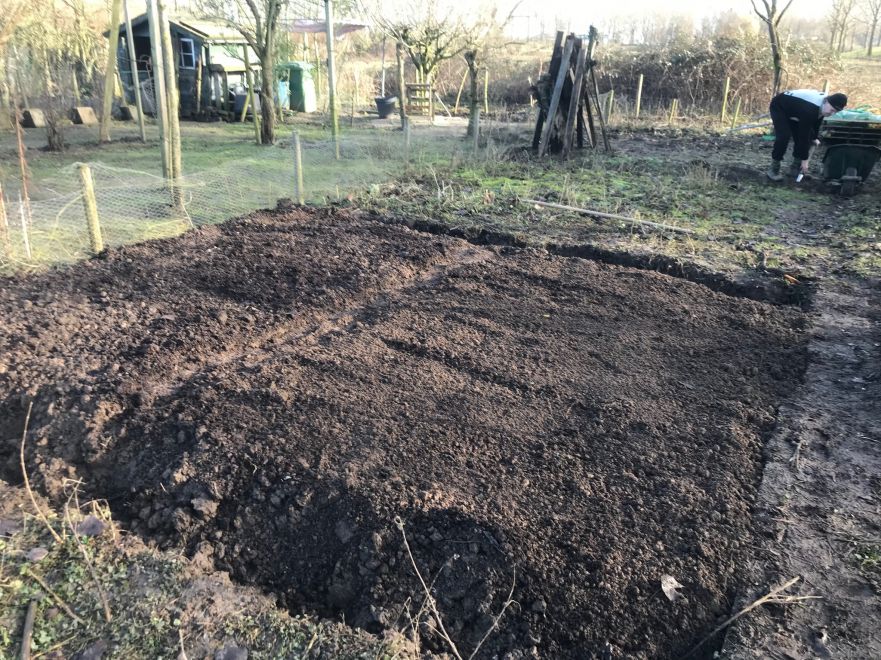 Wij zijn afgelopen week begonnen. We hebben 200 vierkante meter dus op tijd beginnen zal veel uitmaken. We zitten op grond met klei en zand die in de zomer keihard is. Nu is ie vochtig en dus makkelijker te bewerken.