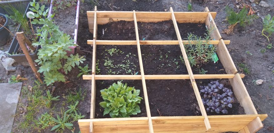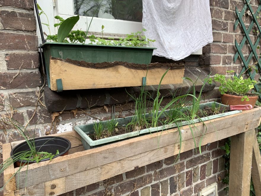 Deze bakken staan achter in mijn tuin, niet in de moestuin, ik heb de kruiden en groenten die ik vaak gebruik liever dichtbij. De kropsla en spinazie oogst ik nu voor het eerst. De andijvie is bijna klaar om geoogst te worden. Wat gaat het snel allemaal...