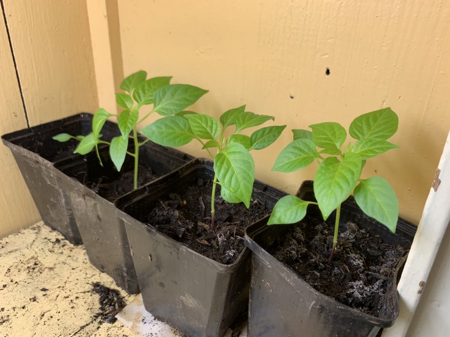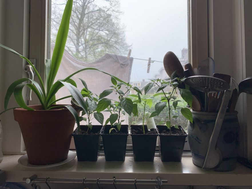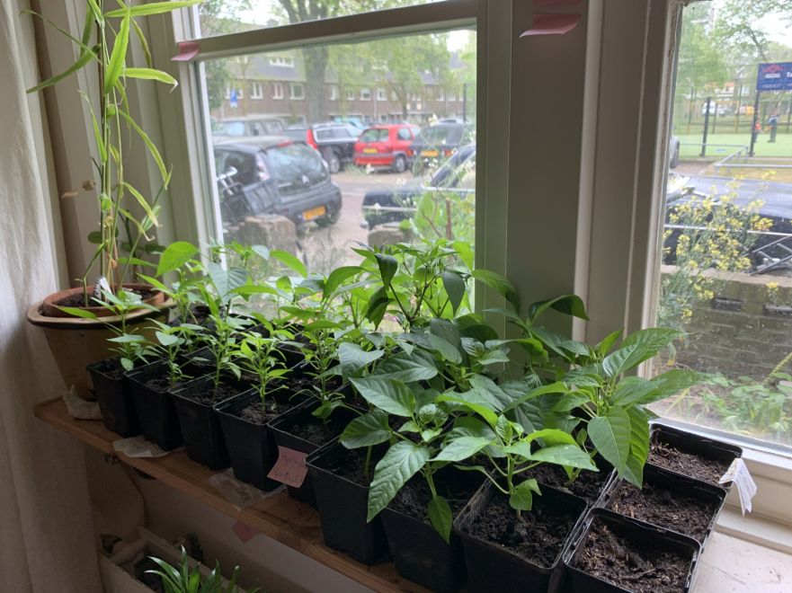 Overal in huis staan peper- en paprikaplanten. De geelwortel, kurkuma begint uit te schieten. Op de eerste foto links, dat grasachtige dat is de gember die ik binnen heb laten overwinteren. De citroenverbena heb ik teruggeknipt en begint uit te schieten. Twee rabarbers die eerst thuis moeten groeien voordat ze naar de moestuin gaan. Prei en radijsjes onder het raam. En tomatenplanten zijn gezaaid en komen op en staan ook overal. En daar komen dan ook nog de pompoenen en de courgettes en de mais bij. Ook heb ik veel bloemen gezaaid.