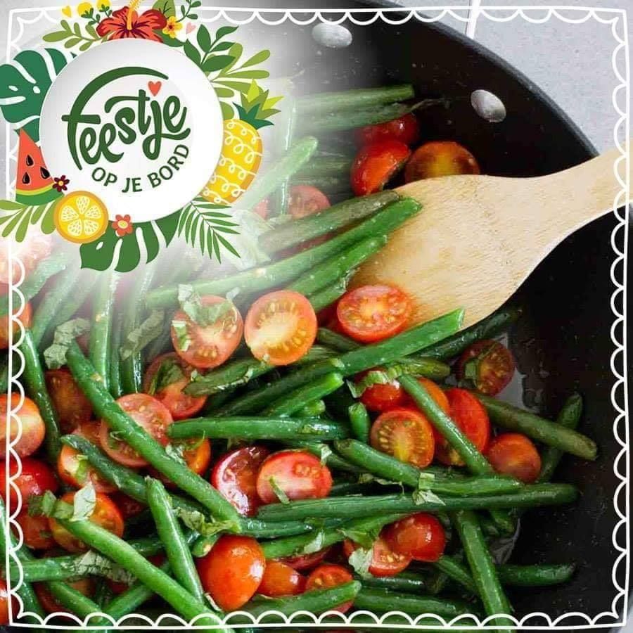 Bak de schotel ongeveer 30-35 minuten in de oven. Na 20 minuten even doorscheppen en de cherrytomaatjes en de lente-uitjes toevoegen voor de laatste 10 minuten in de oven.