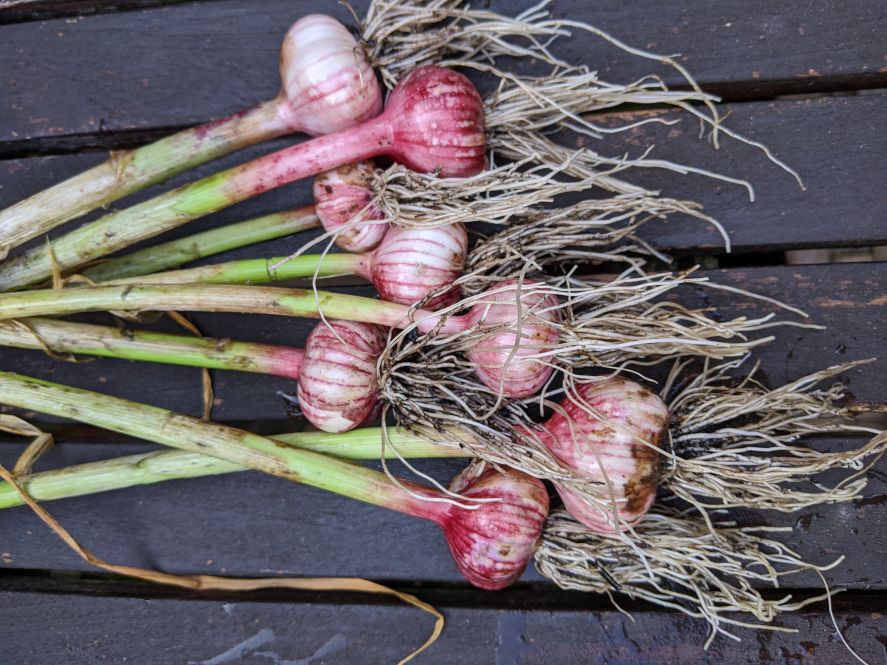 Hier was het loof slap gaan hangen, dus daarom nu toch maar geoogst. Ik weet bij uien/knoflook nooit zo goed wat het juiste moment is. Maar ben niet ontevreden over deze oogst