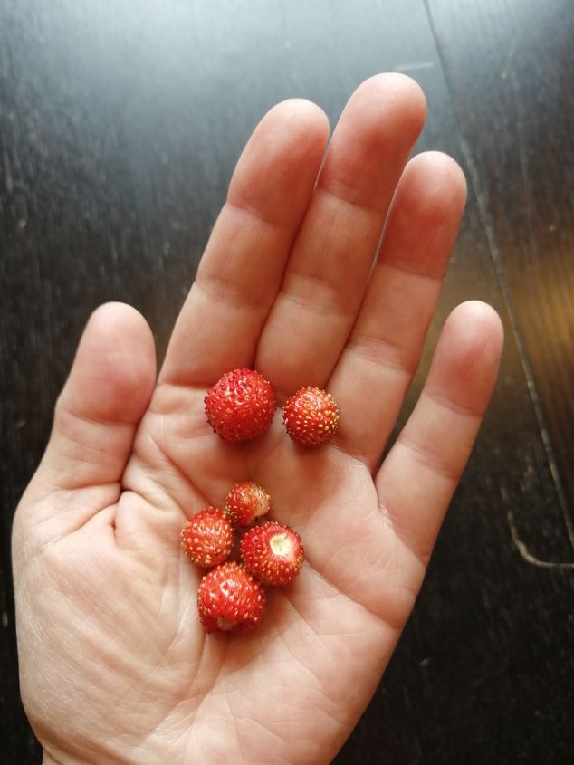 Dit zijn zaailingen van een bosaardbei, ik heb ook nog een bosaardbei met grotere vruchten. We plukken en eten wat rijp is.