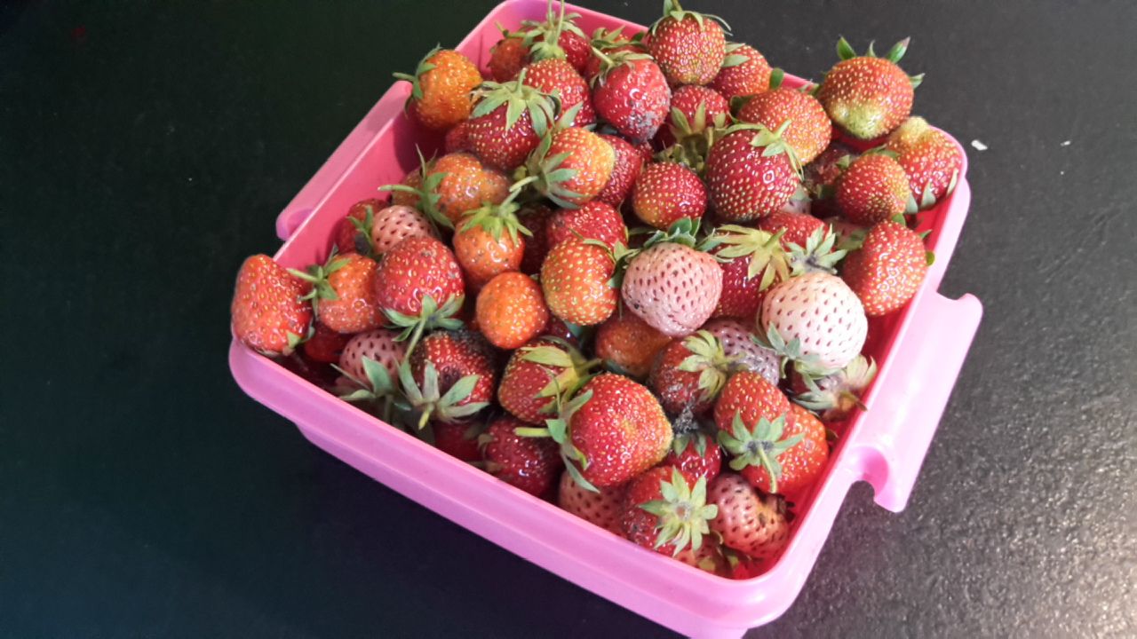 Vandaag weer een megabak aardbeien. Ik ontdekte ineens dat mijn ananasaardbeitjes het wel overleefd hebben. Ze hebben zich flink vermenigvuldigd tussen de rode aardbeien. Hier in de bak kun je ze herkennen door hun witte tot lichtroze kleurtje met donkerrode pitjes erop. Ze smaken ook echt anders, naar ananas.